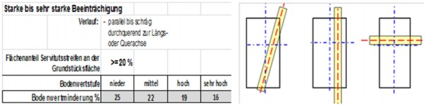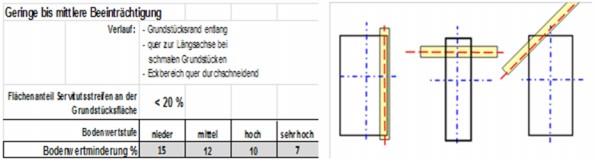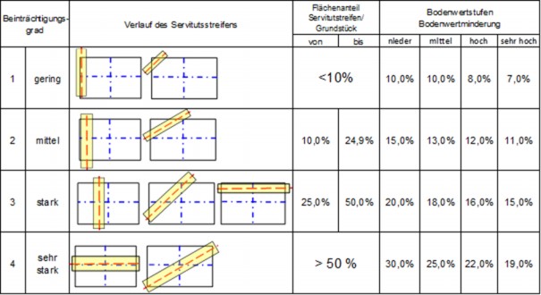 Der Beeinträchtigungsgrad für eine Leitung ist entsprechend der Verkehrswertstufe und Verlauf des Leitungsservitutes auf dem belasteten Grundstück mittels untenstehender Tabelle (DI Friedrich Bauer 2012/2013) einzuschätzen.