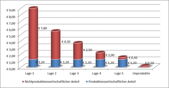 Da bei Waldböden in der Regel geringere Bodengüte und Lagenachteile gegenüber landwirtschaftlich genutzten Flächen gegeben sind, müssen Abschläge für geringere Bodenbonitäten und Bringungserschwernisse aufgrund Steilheit des Geländes und sonstige ungünstige Bringungsverhältnisse bei der Anwendung von Preisrelationen zu landwirtschaftlich genutzten Flächen berücksichtigt werden.