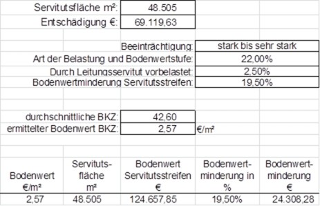 7)Berechnung der Bodenwertminderung (%-Satz der Bodenwertminderung x Bodenwert der Servitutsfläche)
