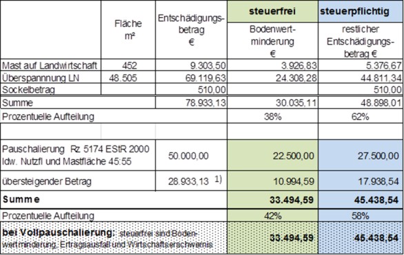 Der dauernde Nutzungsentgang besteht aus der Differenz des Ertragswertes zwischen den jeweiligen Bestandesverhältnissen mit ihren spezifischen Nutzungspotentialen und dem vollständigen Nutzungsentgang bei Entfall der Holzzuwachspotentiale auf dem Servitutsstreifen. Erfahrungsgemäß kann der Durchschnittswert des dauernden Nutzungsentgangs mit 50% des durchschnittlichen gemeinen Wertes von Wald bzw. mit 100% des gemeinen Wertes des Waldbodens auf dem Servitutsstreifen festgesetzt werden. Übersteigt eine Entschädigung aus dem Titel dauernder Nutzungsentgang diesen Wert, muss, der Wert des dauernden Nutzungsentgangs individuell nachgewiesen werden, um im Rahmen der Voll- bzw. Teilpauschalierung erfasst werden zu können. Bei einer Entschädigung für dauernden Nutzungsentgang außerhalb der Pauschalierung sind derartige Entschädigungen jedenfalls steuerpflichtig (vgl. Rz 5174).